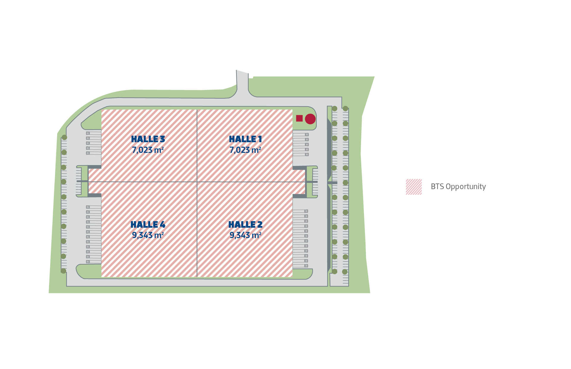 | Gebäude | Verfügbare Entwicklungsfläche | Verfügbare Lagerfläche | Verfügbare Bürofläche | Gesamtfläche | BREEAM | EPC | LED Beleuchtung | Parkplätze |
