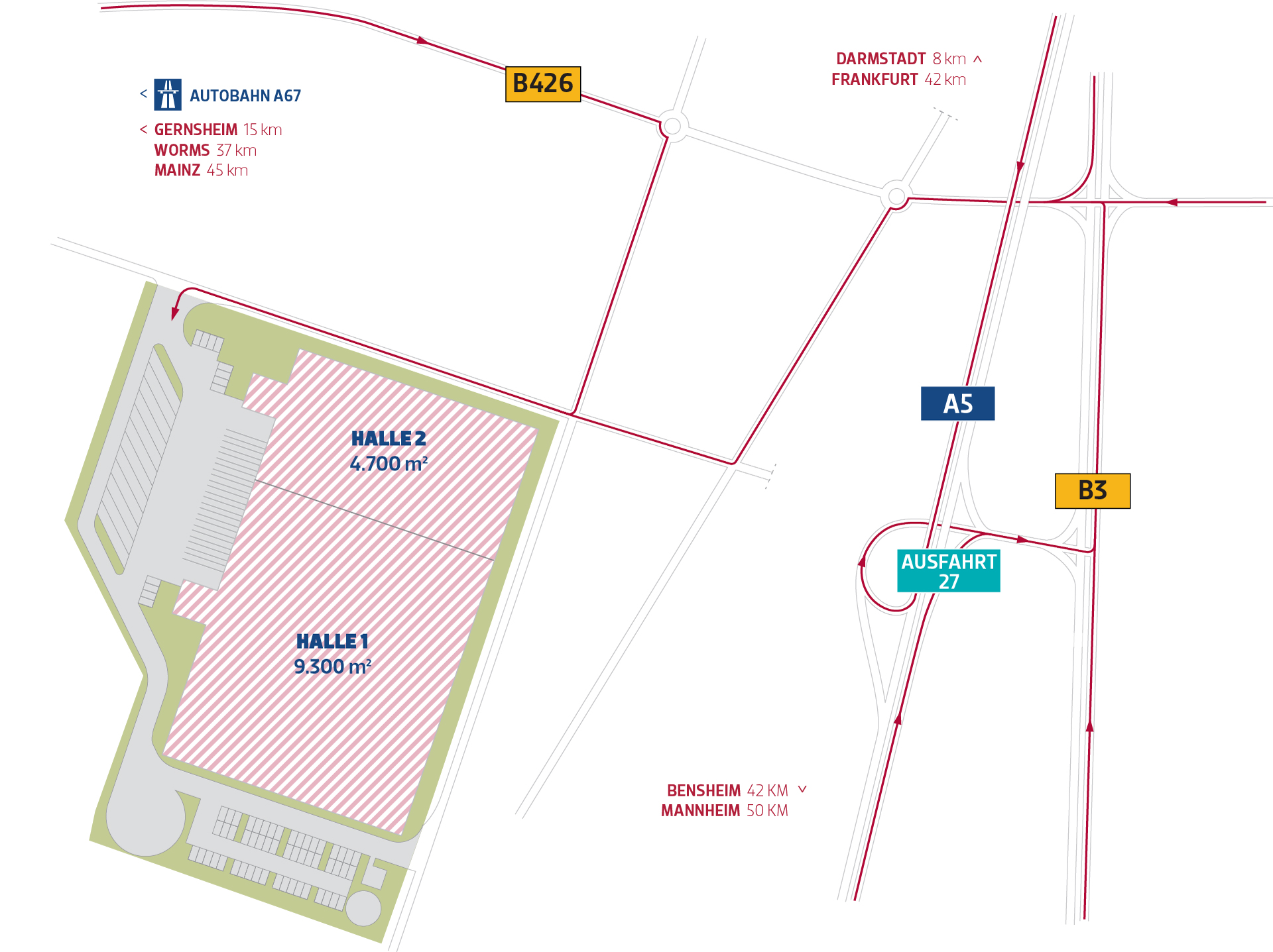 P3 Pfungstadt liegt zwischen Darmstadt und Frankfurt im Rhein‑Main‑Gebiet, dem Logistik‑Hotspot mit rund fünf Millionen Einwohnern. Dank direktem Anschluss an die A5 und A67 erreichen Transporte Darmstadt in ca. 20 Minuten und Frankfurt in rund 40 Minuten.