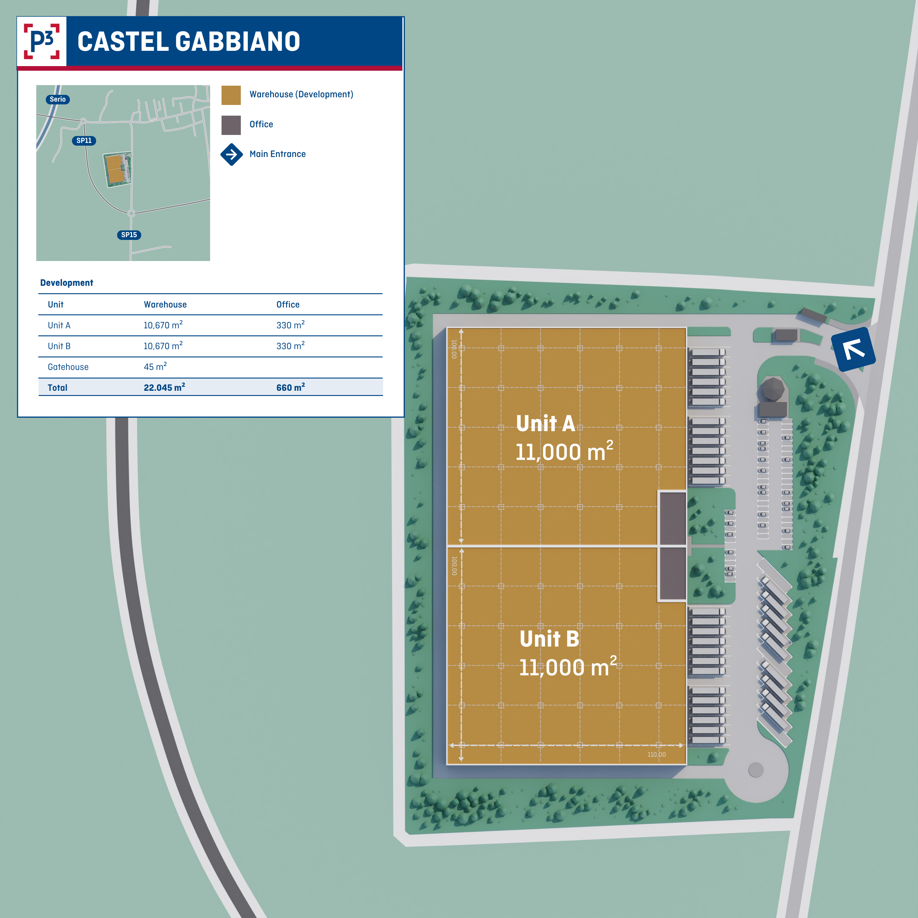 P3, as advisor of Giano Fund, is developing a new logistics warehouse in Castel Gabbiano (CR) with a total GLA of 22,045 sqm, divisible into two independent units. The warehouse will feature a clear internal height of 12 meters.