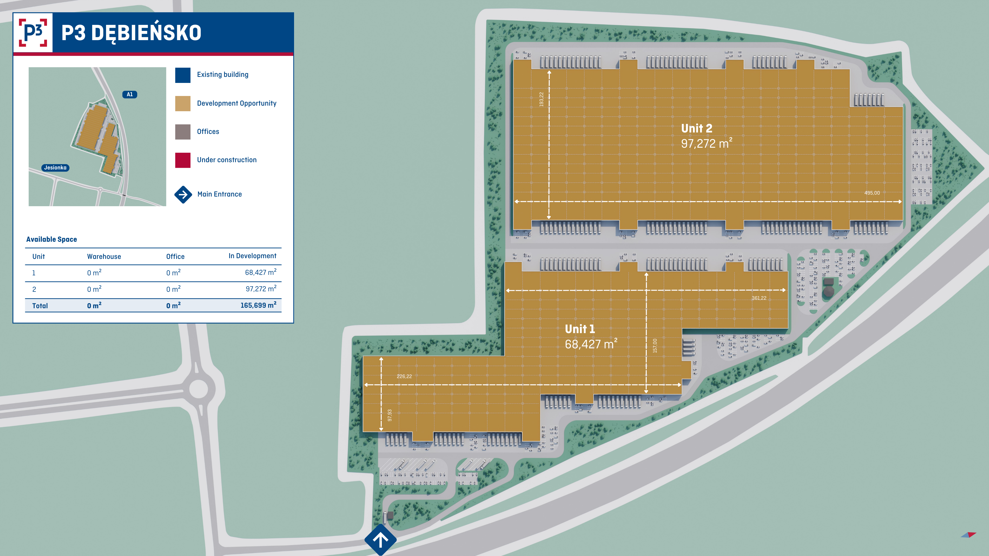 A planned new investment P3 Debiensko is located in Upper Silesia south of Katowice Conurbation at A1 highway exit. The property is well connected to main road arteries and makes a great base for domestic and foreign transport. A plot has an area of 22.4 ha, where a modern warehouse & office building with a total area of approx. 164,000 sqm will be built.