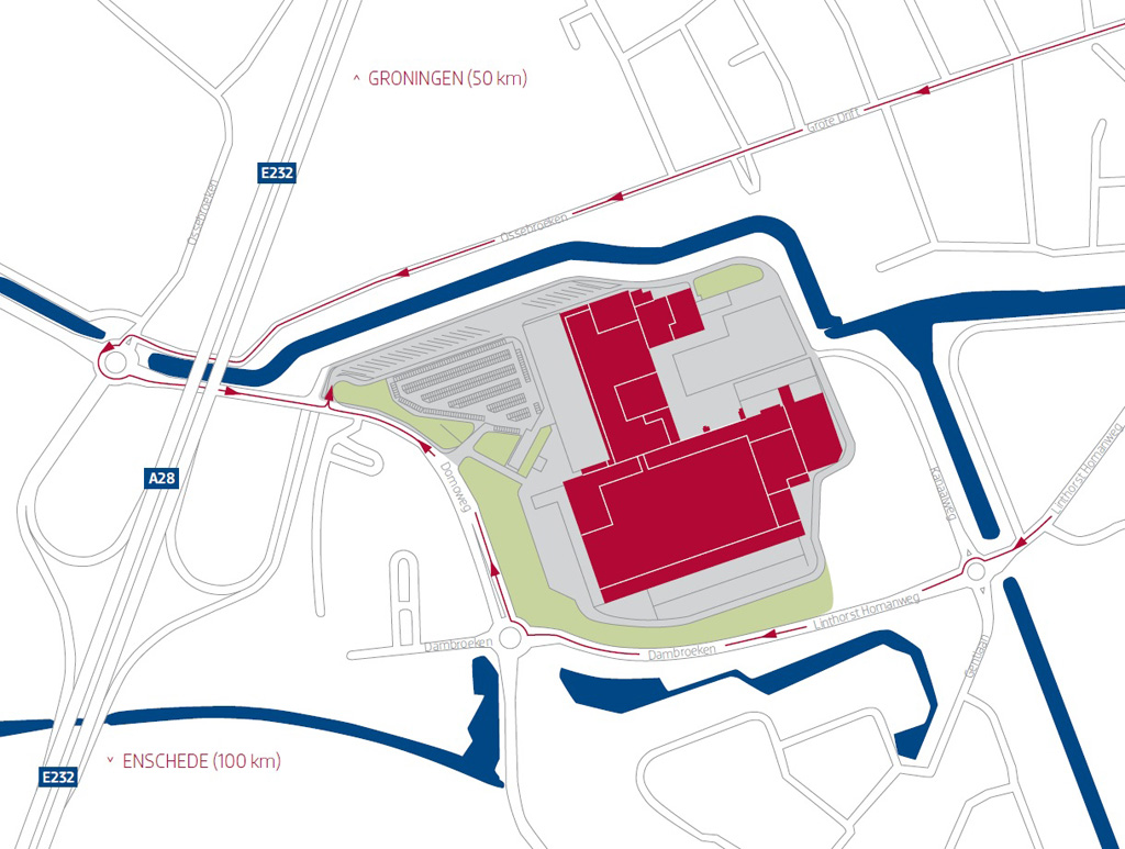 La propiedad está situada en Beilen, en el norte de Holanda, cerca de las autopistas A28 (Groningen-Zwolle - Utrecht), A37 (Hoogeveen - Alemania) y A32 (Meppel-Leeuwarden). Todas las autopistas ofrecen un buen acceso a la parte norte de los Países Bajos. La A28 también ofrece un buen acceso a la parte central de los Países Bajos.
