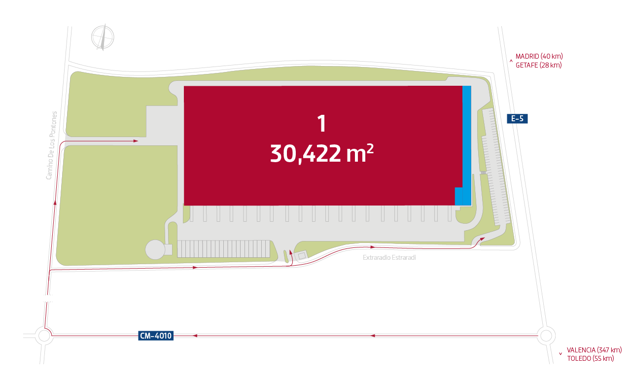 Situé dans la zone industrielle établie de Seseña dans le centre de l'Espagne, cette propriété est facilement accessible à d'autres villes éminentes à travers le pays. Il se trouve à environ 37 km au sud de Madrid, via les autoroutes R4 et E5. Les grandes entreprises de la région comprennent Lidl, Artesolar et DHL. La propriété a été construite en 2000, comprenant une unité logistique rectangulaire et autonome de 30 422 m2. Le bâtiment est construit en béton préfabriqué avec une façade en métal stratifié.