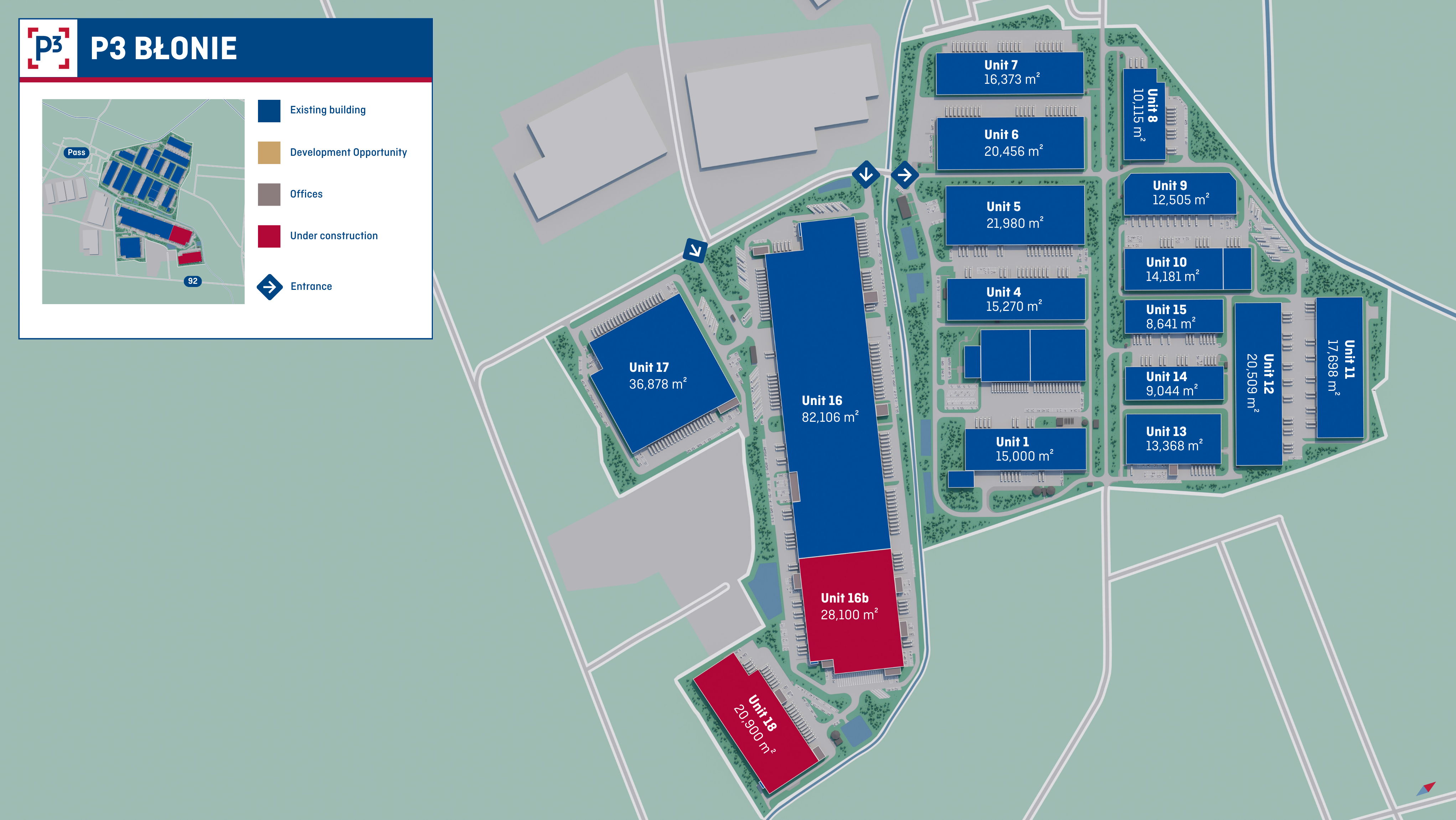 Le parc P3 de Blonie se situe au point d'intersection de la route nationale 92 et de l'autoroute A2, à 27 km à l'Ouest de Varsovie, sur l’axe stratégique « E30 », très important pour le transport routier transeuropéen. Au total, le parc comprend 15 immeubles, construits entre 1999 et 2022.