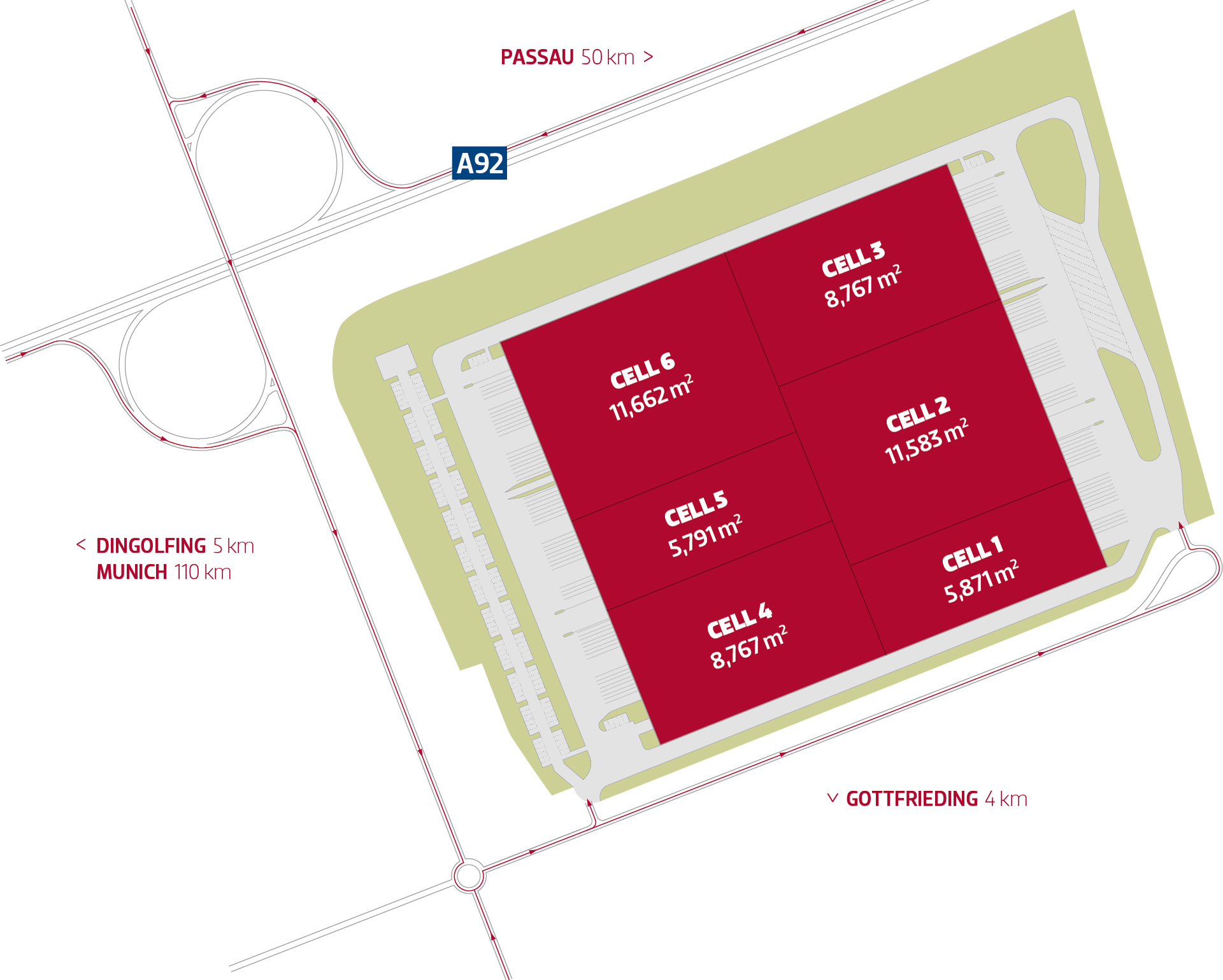P3 Gottfrieding is located in the economically strong district of Dingolfing-Landau and has a direct connection to the A92 motorway. Via the motorway junction “Deggendorfer Kreuz”, the crossing of the motorways A3 and A92, the site is connected to Nuremberg to the north and to Austria and the Czech Republic in the southeast. The B20 motorway, the second most important north-south connection in Bavaria, is nearby.