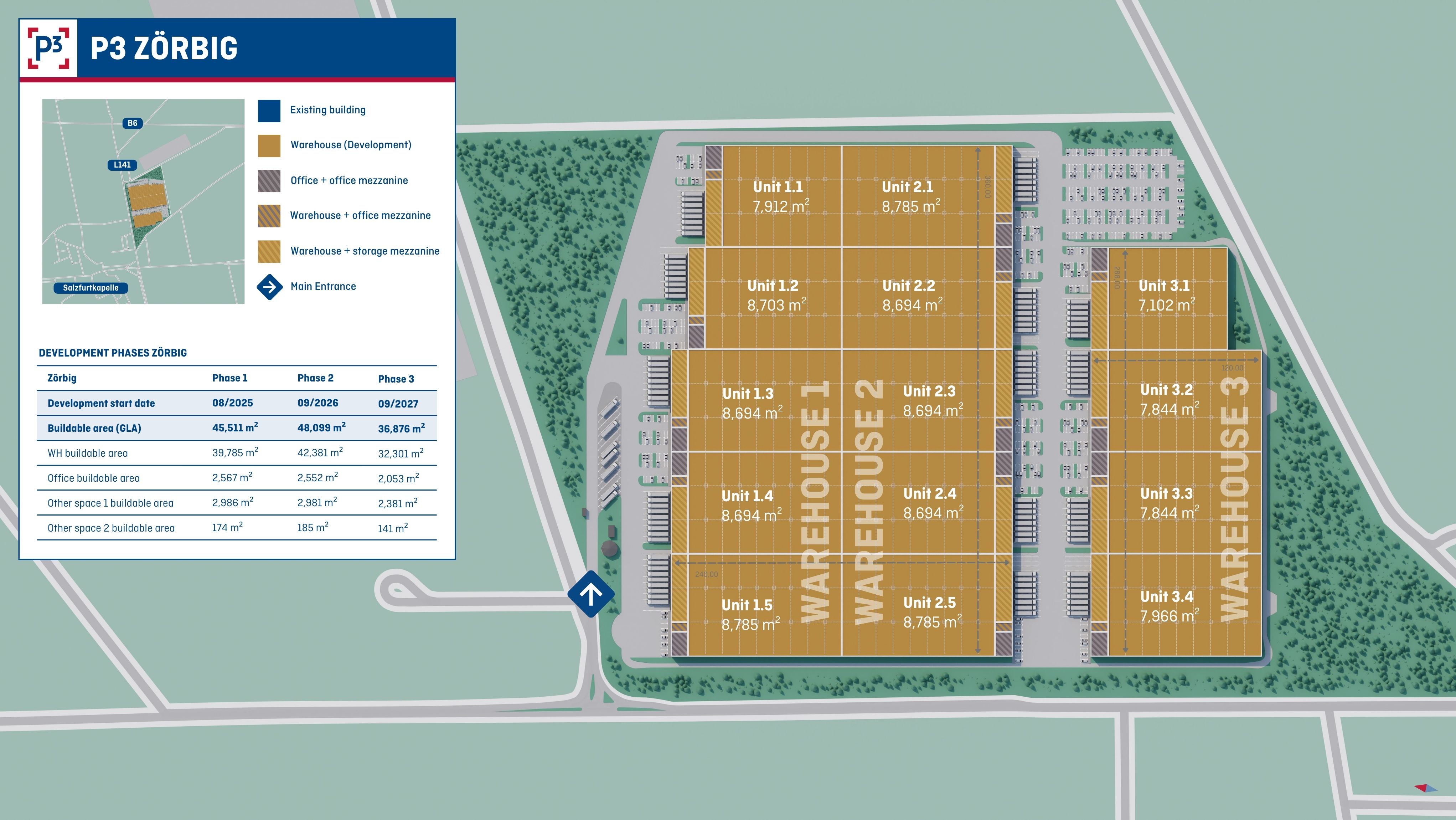 The development is designed to meet the requirements of medium to large companies in retail, e-commerce, and light production. Construction is scheduled to start at the end of 2025 and will be realized in three phases. Each hall can be divided into several units, allowing flexibility for different operational setups.