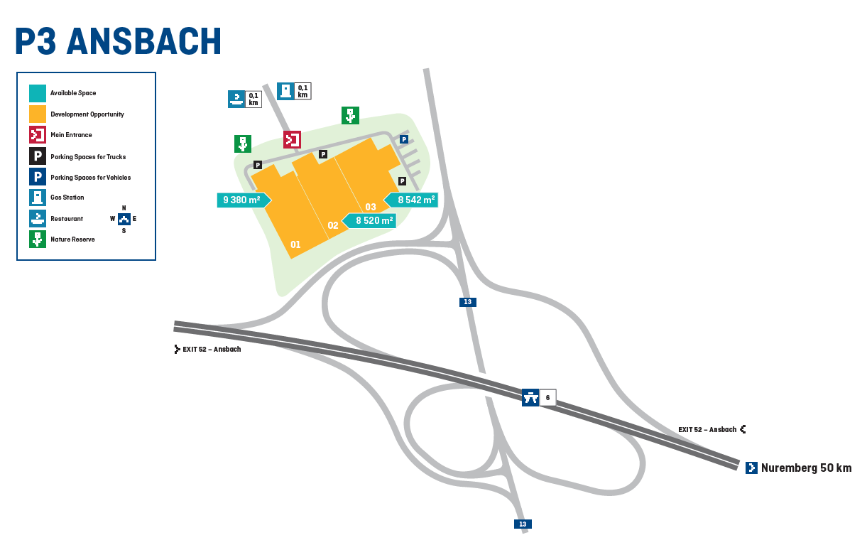 The site is located 40 kilometers from Nuremberg in an excellent location directly at highway junction 52, via which the A6 can be reached in less than two minutes without passing through a city. Only a few kilometers further on, the A6 joins the A7 at the Feuchtwangen/Crailsheim interchange. A bus stop within five minutes walking distance provides an optimal connection to the Ansbach train station and the national public transport.
