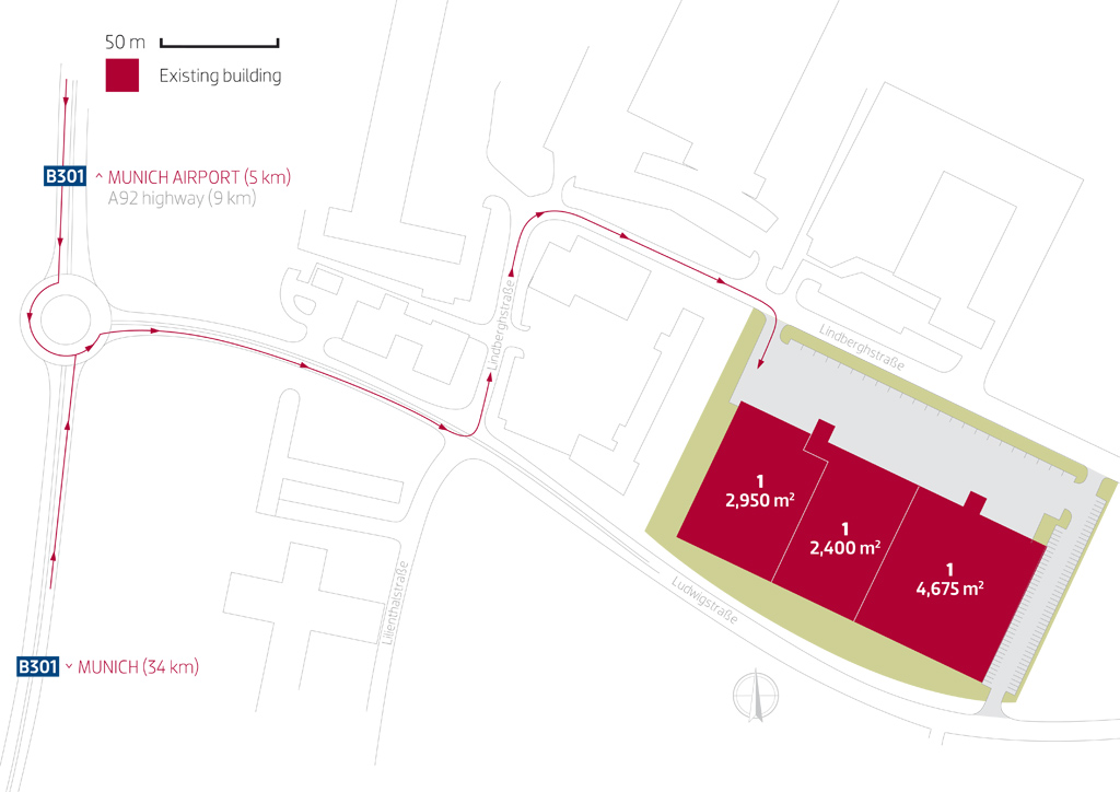 Municipiul Hallbergmoos se află la nord de München. Proprietatea este amplasată la aprox. 25 km de München, la aproximativ 3 km de aeroportul din München şi la aprox. 14 km de Freising. Are conexiune la autostrada A92 (München-Deggendorf) şi la drumul naţional B11. Întreaga proprietate este formată dintr-o hală cu o aripă de birouri construită direct pe partea longitudinală, deasupra zonei de livrare. Hala are un singur etaj. A fost construită în anul 2007.