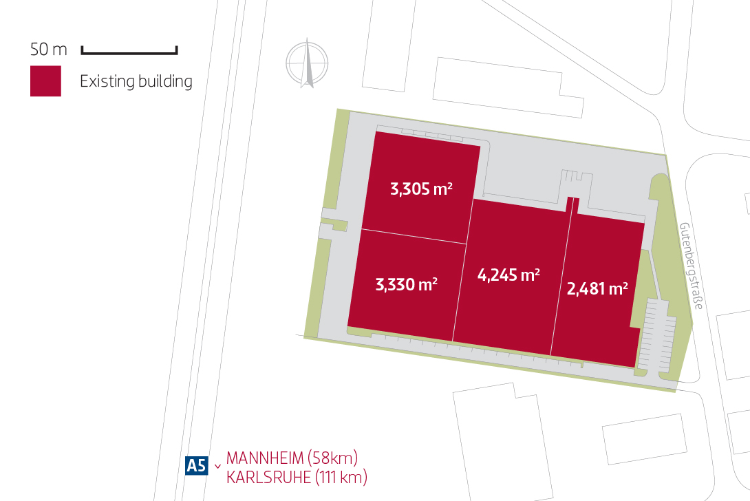Proprietatea logistică este amplasată în zona industrială Weiterstadt, la aproximativ 6 km nord-vest de Darmstadt şi la aproximativ 24 km sud de aeroportul din Frankfurt. Are buni legături de transport rutier, deoarece se află în apropiere de autostrada A5 şi de drumul naţional B42. B42 oferă de asemenea şi legătura ideală dintre zona industrială Weiterstadt şi autostrada A67. În primii ani, Weiterstadt a fost conceput ca o zonă populară pentru hipermarketuri şi depozite. Proprietatea este formată din două hale, care au o construcţie identică, cu spaţii pentru birouri anexate. Halele au un singur etaj şi sunt poziţionate în unghi drept una faţă de cealaltă. Acestea au fost construite în anul 2007.